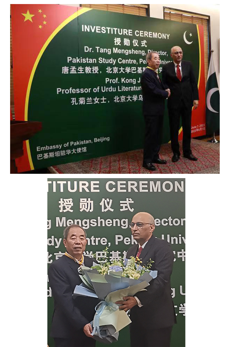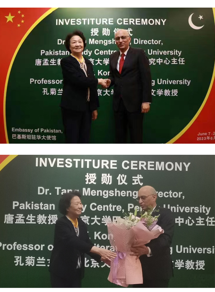 2023年6月7日,巴基斯坦驻华大使馆举办隆重仪式,授予best365网页版登录入口南亚学系唐孟生教授与孔菊兰教授巴基斯坦“卓越之星”勋章,以表彰两位学者在推动乌尔都语教学、增进两国人文交流、增进中巴友谊方面作出的重要贡献。巴基斯坦驻华大使莫因·哈克、政务参赞穆罕默德·卢曼·艾哈迈德、武官Ranna Faisal Rafiq准将、社会福利公使Ijaz Ahmad、科技公使Kamran Rasheed博士,以及原中国驻(巴基斯坦)卡拉奇总领事安启光、三峡集团财务总监王少峰等各界人士出席了授勋仪式。