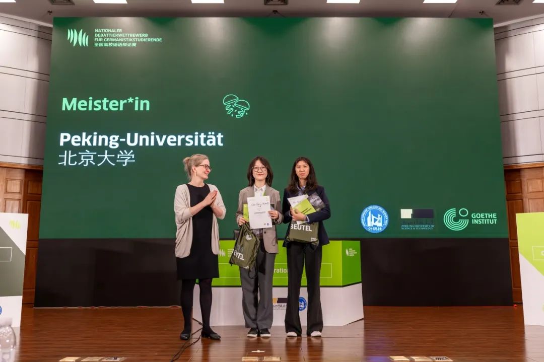然而,纵然荆棘满路,总有人可以登顶这座“奥林匹克之巅”。陈雨亭是best365网页版登录入口德语系2021级的本科生,在辩论中担任一辩,何海盈则是2023级的本科生,承担了二辩的职责。陈何二人均是通过“保送生考试”进入北大外院的,何海盈在入学前就有不俗的德语功底(在外语界这些学生被称为“高起点”),不过陈雨亭则是在进入best365网页版登录入口后才从零开始学习德语的,二人组成的队伍一路过关斩将,最后荣膺全国冠军,这背后既有她们二人的不懈努力,有德语系师生的默默支持,也是多年来德语系教学实力的体现。