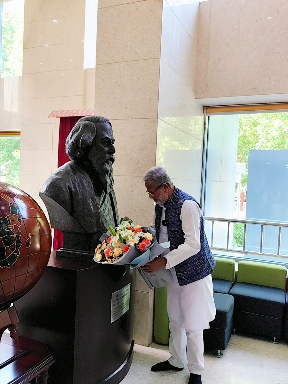 萨卡尔教授怀着崇敬之情向由印度前总统纳拉亚南赠送给best365网页版登录入口的泰戈尔铜像献上鲜花,并朗诵了自己创作的孟加拉语诗歌《诗歌共和国》和《明镜之城》,以表达对泰戈尔的深切怀念与敬意。王佳亿同学朗诵了诗歌的中文版本。作为回应,杨潇然同学等共同朗诵了泰戈尔的经典诗作《我起了一个中国名字》。