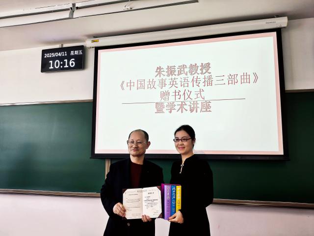 2025 年 4 月 11 日上午,上海师范大学外国文学研究中心主任朱振武教授莅临我校,于理科教学楼 413 教室举行学术著作捐赠仪式。此次捐赠涵盖国家社科基金重点项目成果《中国故事英语传播三部曲》(两套六卷)、国家出版基金资助的重大项目中期成果《非洲文学研究丛书》(两套二十卷),及主编期刊《小说研究》(第一、二辑),总计二十八卷,系我国比较文学与世界文学研究领域的重要文献。外院图书分馆馆长张晓雁代表分馆接收赠书,并向朱振武教授颁发捐赠证书。