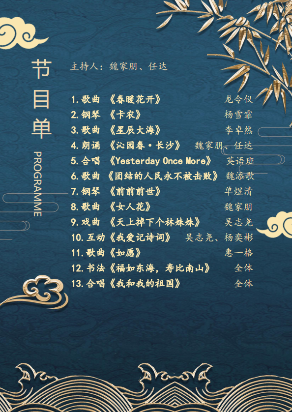 从《春暖花开》清新的意境和灵动的旋律,《星辰大海》恢弘悠扬的曲调和激昂澎湃的高音,到《团结的人民永不被击败》的铿锵有力和《女人花》的温柔深情,再到《如愿》如诗一般将亲情和家国情娓娓道来,志愿者们用歌声绘就了温暖明丽的画面;两首钢琴演奏,《卡农》在自然流畅的旋律中展现回旋往复式的浪漫,《前前前世》则以明亮的调性和轻快的节奏展现青春的色彩;诗歌朗诵《沁园春·长沙》中“曾记否,到中流击水,浪遏飞舟”的奋勇唤起了豪情壮志,越剧唱段《天上掉下个林妹妹》中“娴静犹如花照水,行动好比风拂柳”的生动则将大家带入到《红楼梦》如梦似幻的世界中,余味无穷。志愿者们将自己的爱心和热情融进这些节目,得到了老人们的一致夸赞和如潮掌声。音乐与欢笑声相伴,好戏连台,联欢会也逐渐走向了高潮。