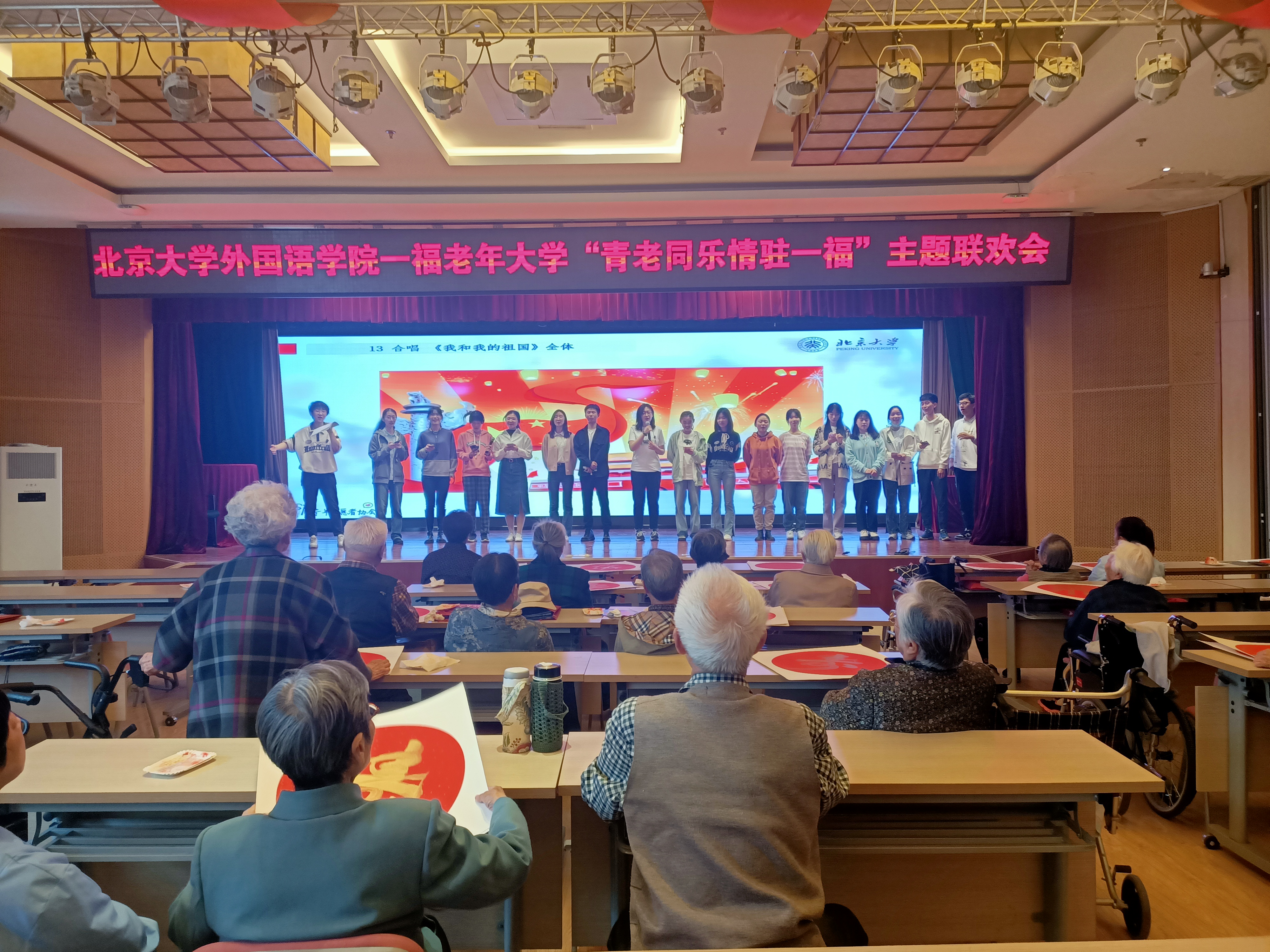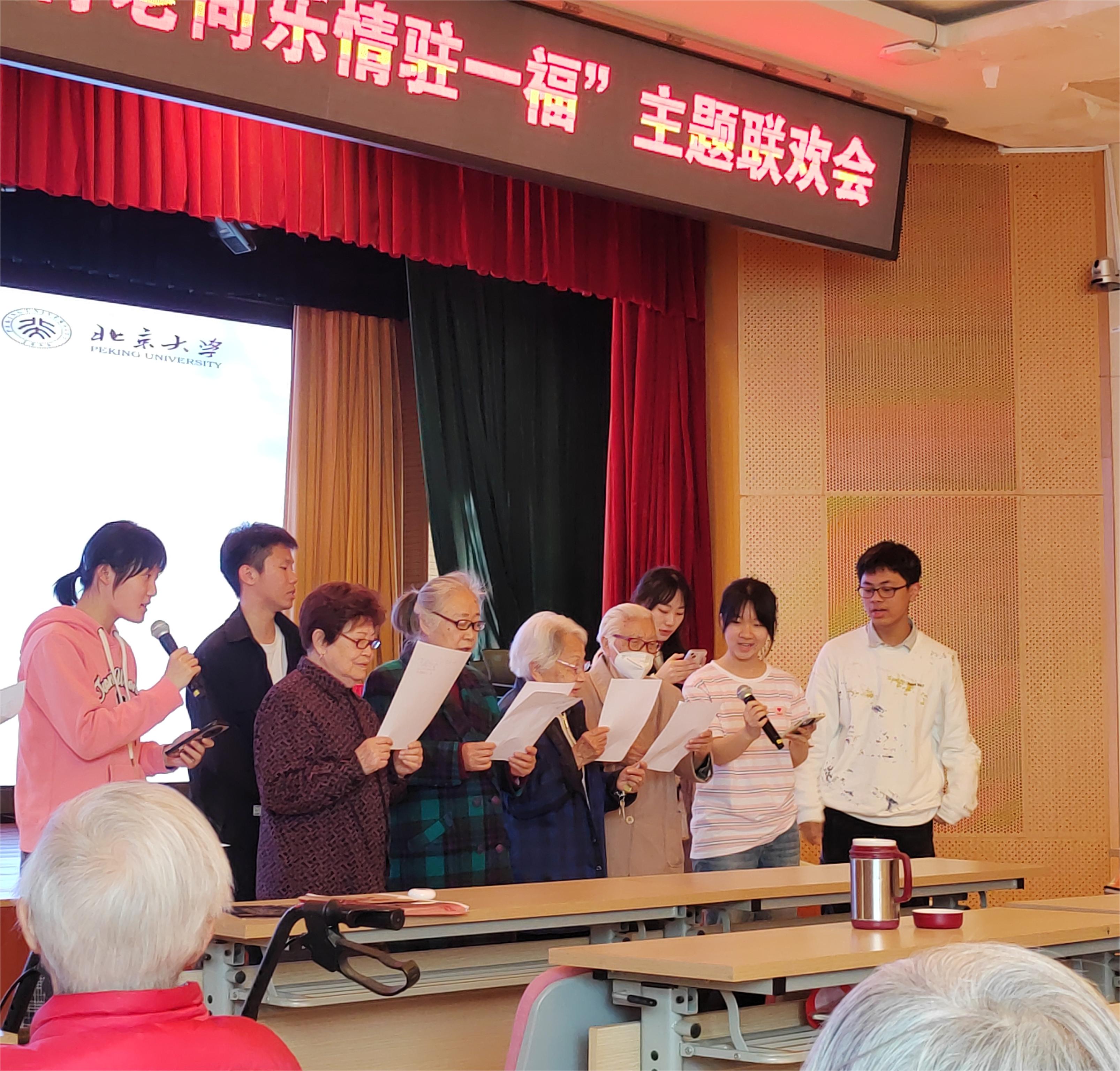 最后,志愿者们同老人们合唱《我和我的祖国》,用这一首真挚动人的抒情歌曲为联欢会画上了一个圆满的句号。