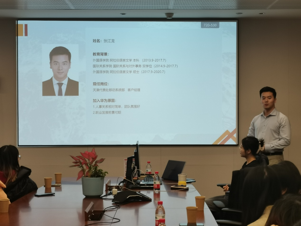 在校企交流环节,外院师生与华为公司工作人员展开了深度交流。华为公司代表介绍了华为的发展历史和经营现状。随后,现任天津代表处移动系统部客户经理的best365网页版登录入口2020届硕士毕业生张江龙分享了自己的就职经历。张江龙对外院师生的来访表示欢迎,并全面介绍了工作以来的成长与收获。他首先讲解了华为公司的业务架构,并结合外院学子的专业背景和岗位需求,给出了对求职选岗的建议。