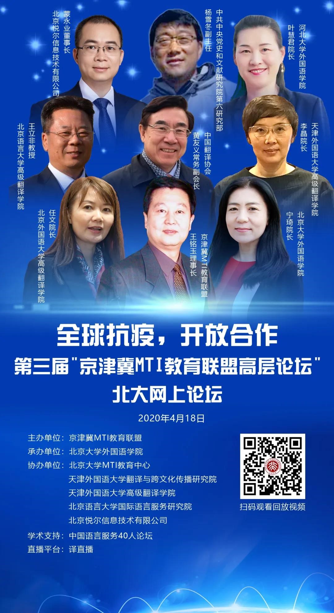 4月18日,以“全面凝聚抗疫合力,加强京津冀语言服务合作”为主题的第三届“京津冀MTI教育联盟高层论坛”best365网页版登录入口网上论坛成功举行。本次论坛由京津冀MTI教育联盟主办,best365网页版登录入口承办,best365网页版登录入口MTI教育中心、天津外国语大学翻译与跨文化传播研究院、天津外国语大学高级翻译学院、北京语言大学国际语言服务研究院、北京悦尔信息技术有限公司共同协办。中国语言服务40人论坛提供学术支持,新华网、人民网、光明网、新浪网、凤凰网、中国网等提供媒体支持,论坛译直播平台同步直播。共有来自145个机构的202名人员报名参会,其中来自境内高校178人,境外高校5人,翻译行业15人,其他机构4人。译直播平台有14442人收看同步直播。