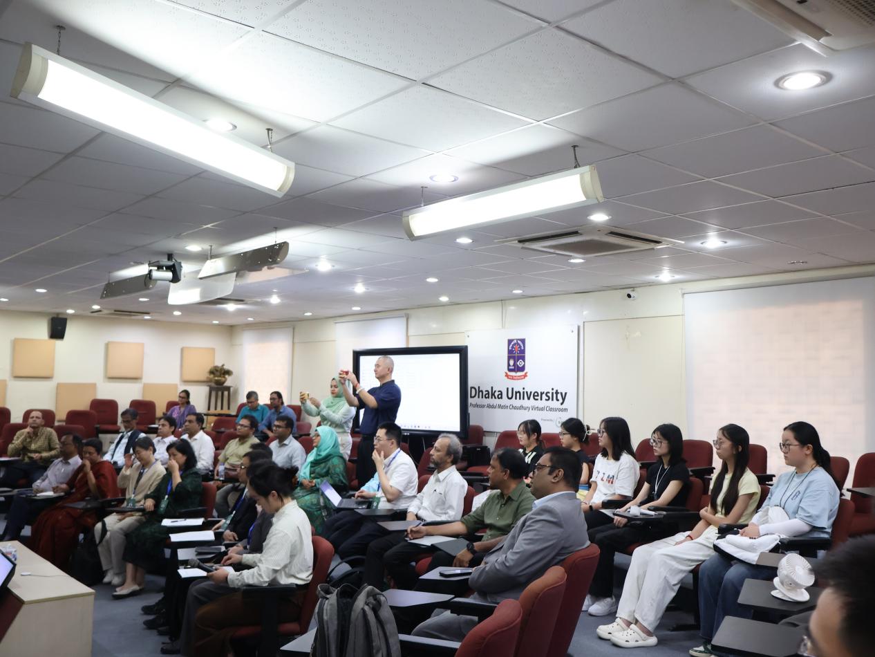 8月11日上午,调研团访问孟加拉国达卡大学(Dhaka University),共同举办"数智时代的高等教育与“一带一路”合作:best365网页版登录入口-达卡大学对话"研讨会。王旭发表《以人民为中心的经济发展与国家安全:中国经验对孟加拉国的启示》专题报告,吴杰伟分享题为《全球化时代的劳动力动态比较研究:以孟加拉国、越南和菲律宾为例》的报告。现场学术气氛热烈,与会学者就相关议题展开深度讨论。